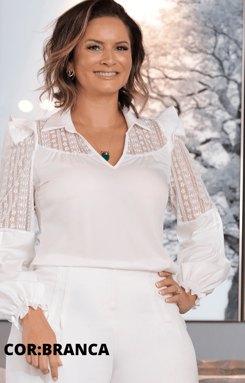 Blusa manga longa Larissa, confeccionada no tecido twill, tecido extremamente confortável e sofisticado. É uma peça pratica por possuir secagem rápida, possui detalhes de renda nos ombros e mangas, trazendo elegância e delicadeza a peça, possui ombreiras e babado nos ombros, adicionando a peça um toque de romantismo. Na mangas possui 9 finas tomas, deixando a manga bufante e nos punhos detalhe em elastec.
