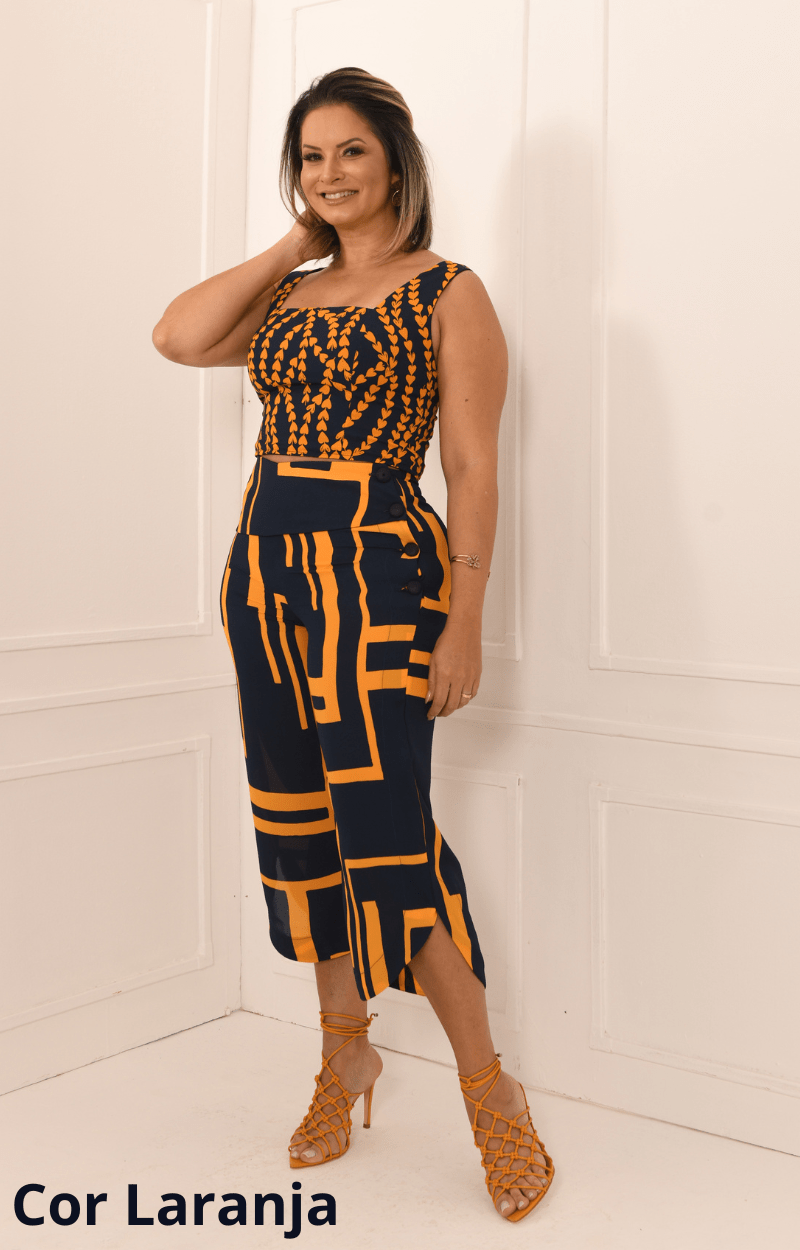 Sua modelagem realça as curvas da mulher pela leveza oferecida pelo tecido utilizado, possui quadruplos buttons na parte lateral, cós largo e detalhe na parte de baixo da calça.