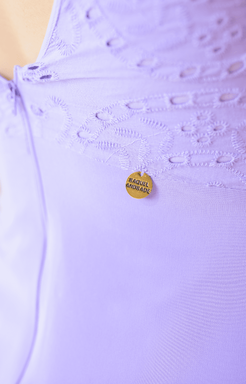 Esta peça possui alças larga com detalhe com manga japonesa na Lese, forrado, fechamento em zíper na parte de trás, possui recortes diagonais que dão estrutura diferenciada e realçar o corpo feminino e possui placa de metal banhada a ouro personalizada da marca Raquel Andrade.