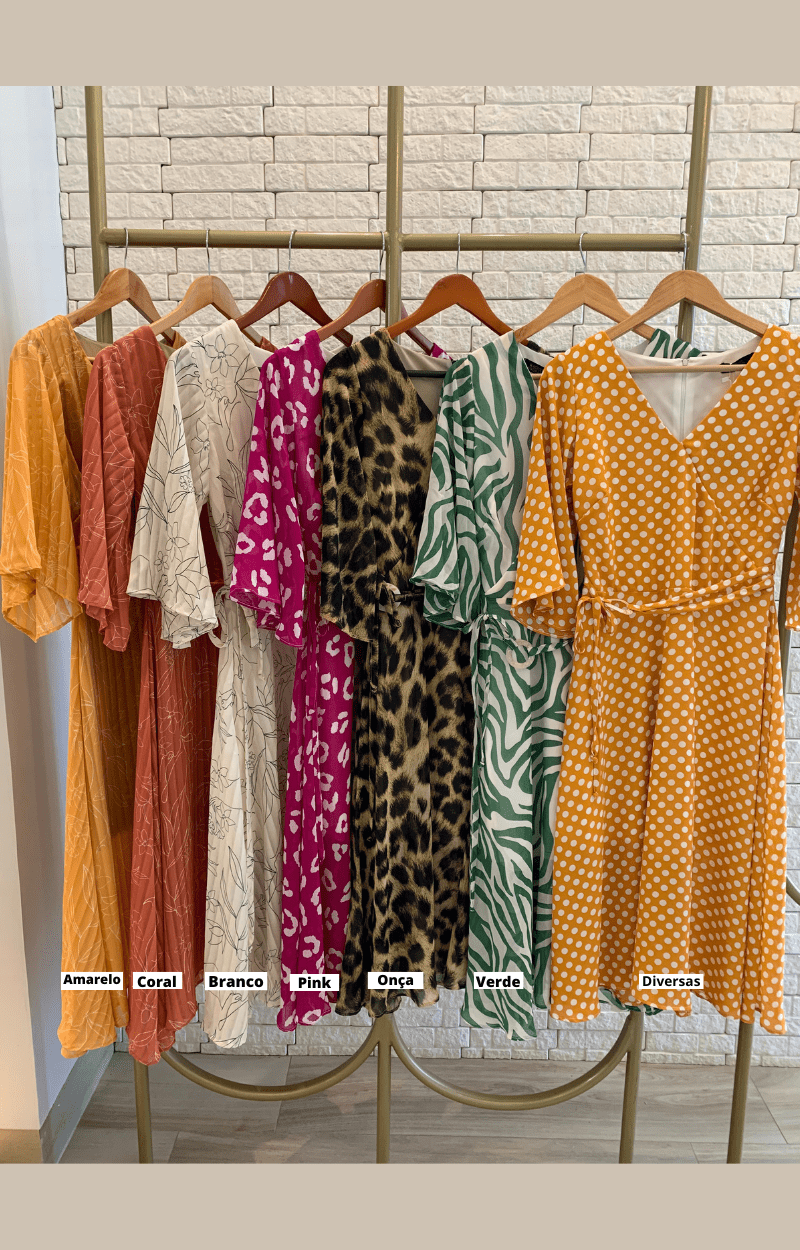 Esta peça possui decote V, mangas flar,forrado, comprimento Midi , possui detalhe em recorte na cintura para acinturamento da peça e argola com amarração na cintura, fechamento em zíper atrás .